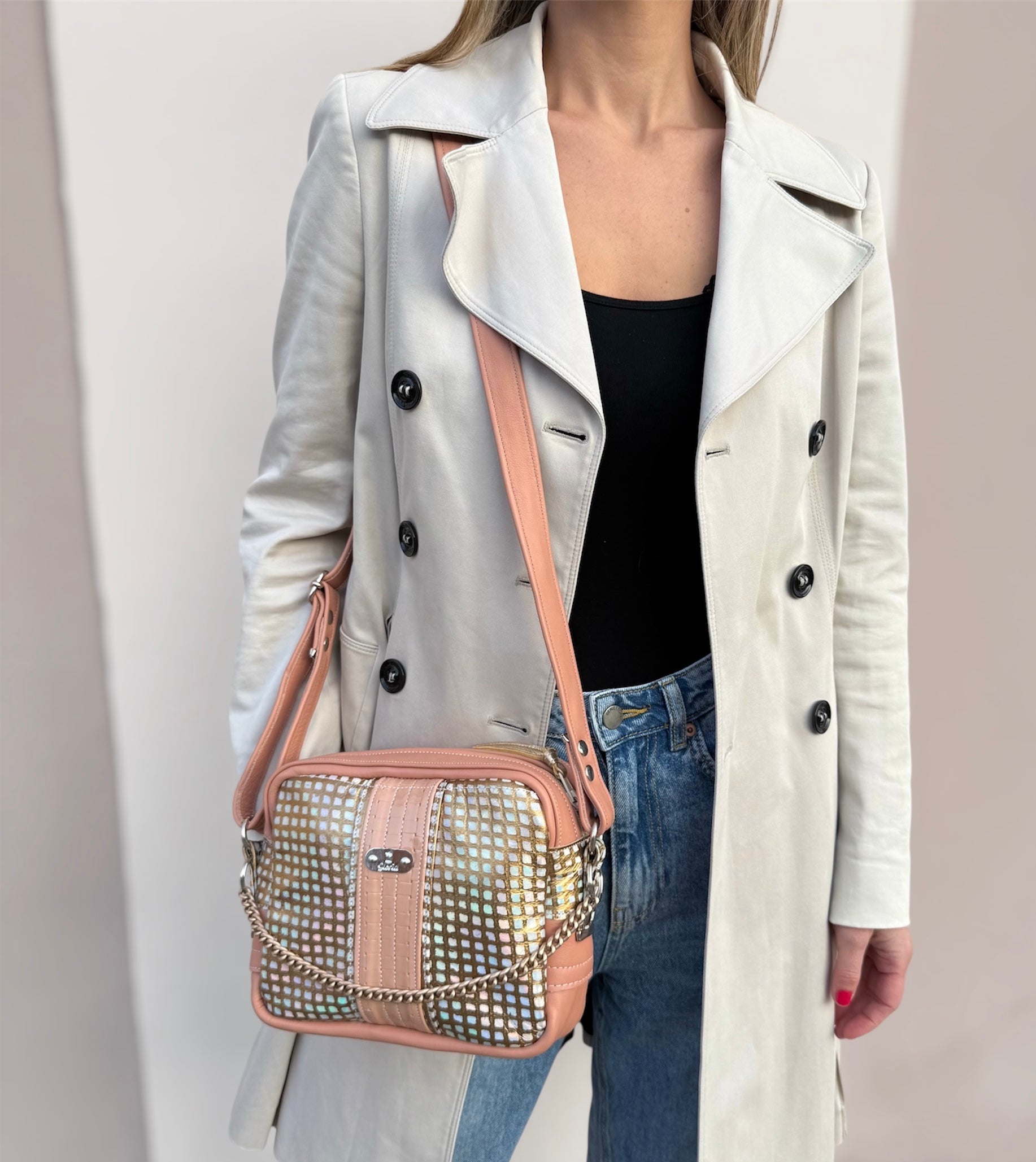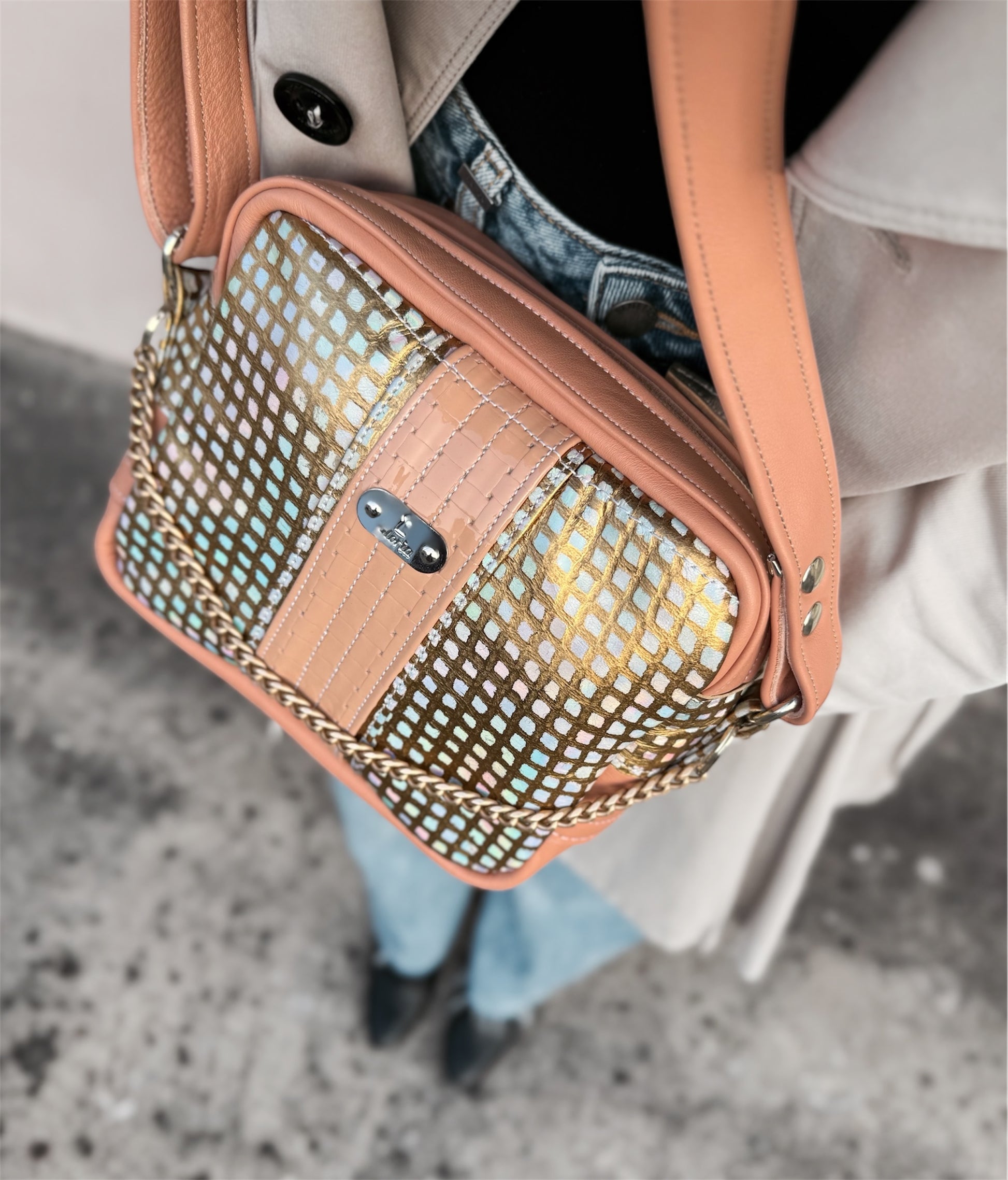 The beautiful shiny iridescent-golden-pink bag is made of genuine leather. It has an adjustable shoulder strap that can be adjusted to your liking depending on how you want to carry the bag - on the shoulder or across the body. On the front, it is decorated with a gold chain, which can be removed if desired. It has a hard bottom, and its color shines even more in the sunlight, where it steals the eye with its beautiful shine.