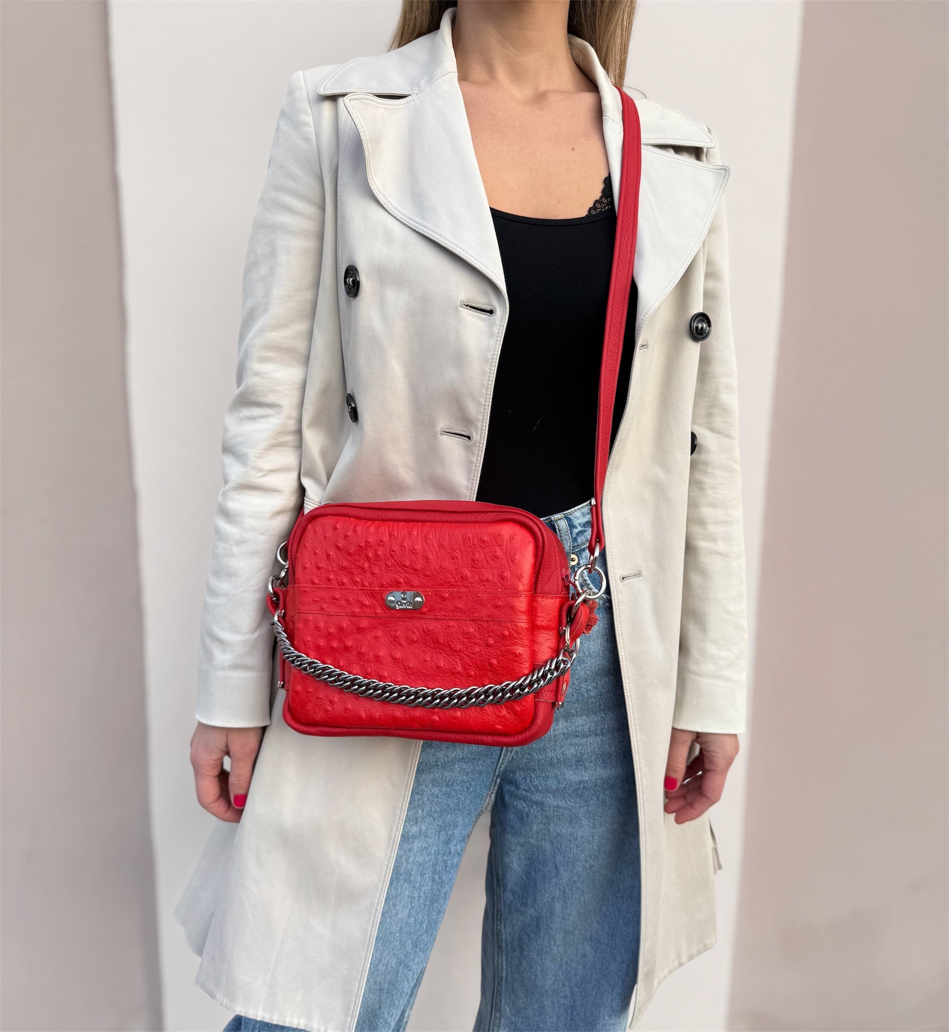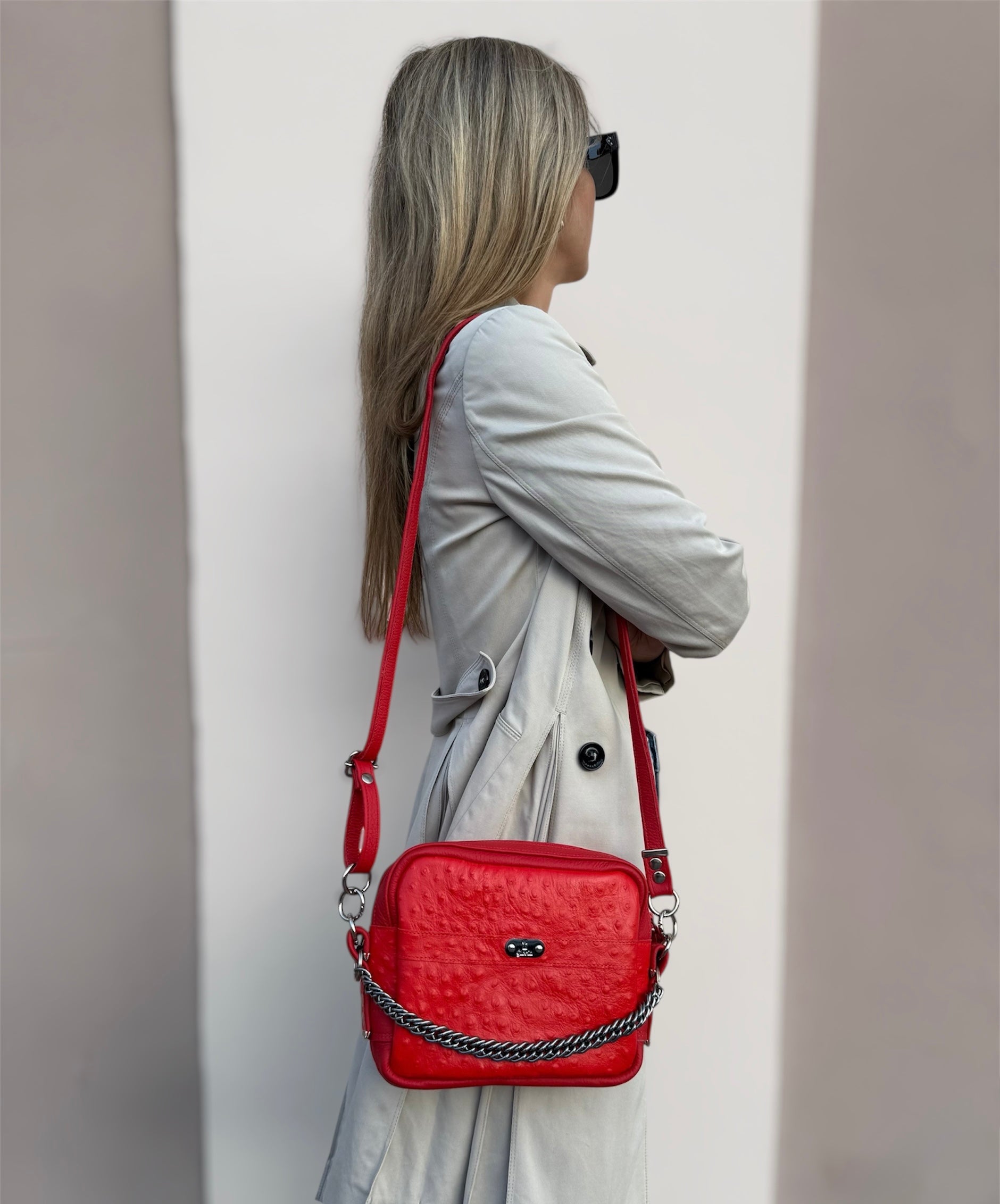 This vivid strawberry red bag is made of high quality genuine leather. The front is made of harder leather with a special structure, while the back is smooth. It can be worn on the shoulder or across the body, as the strap is adjustable in length. It is also decorated with a silver chain, which can be removed if desired.