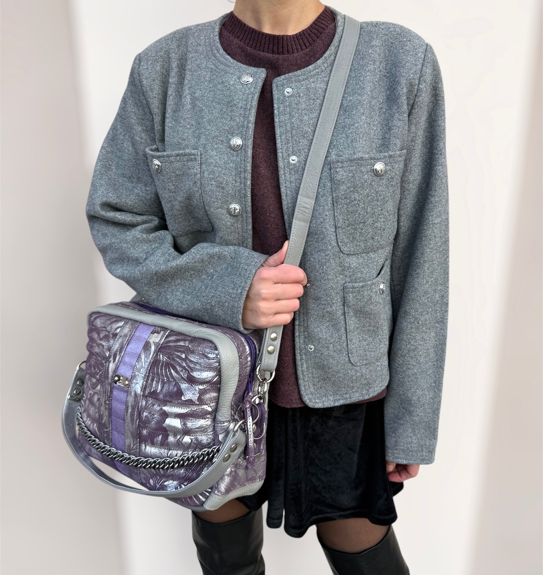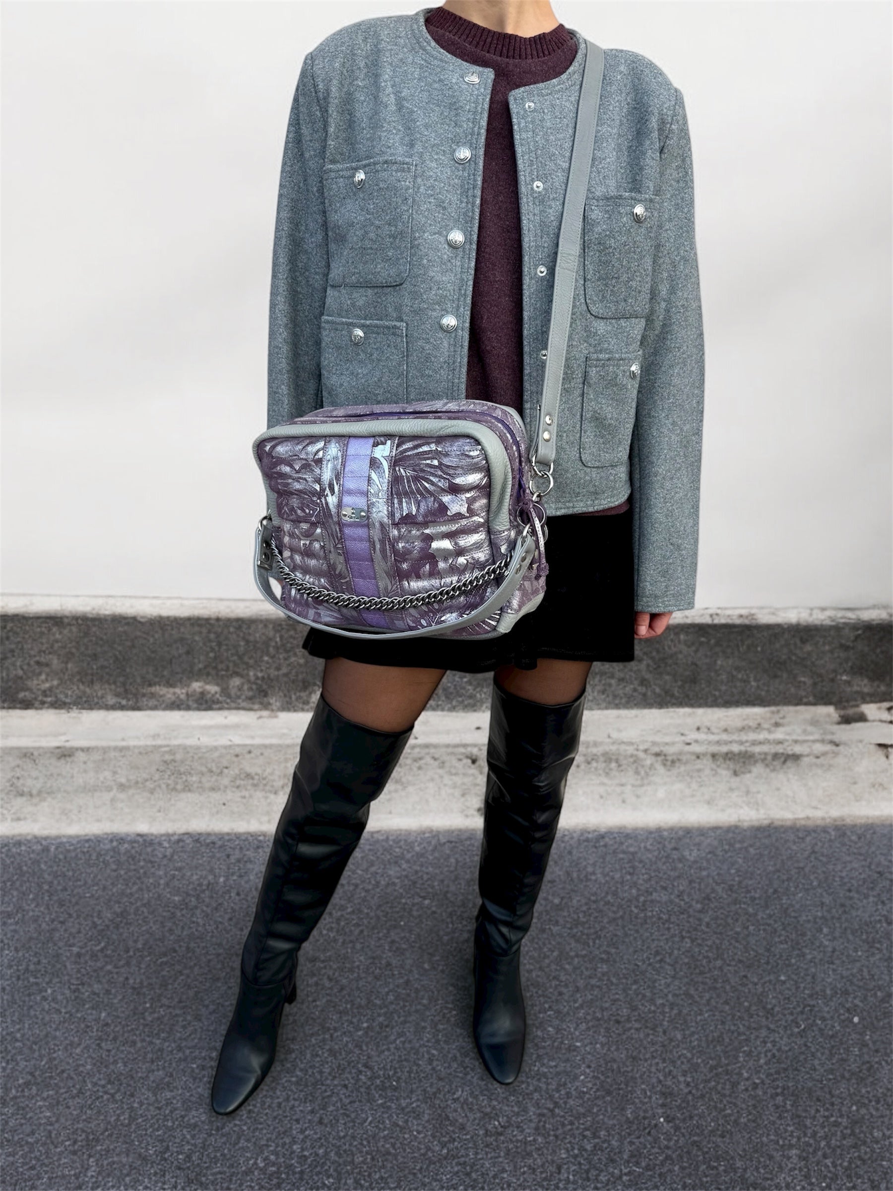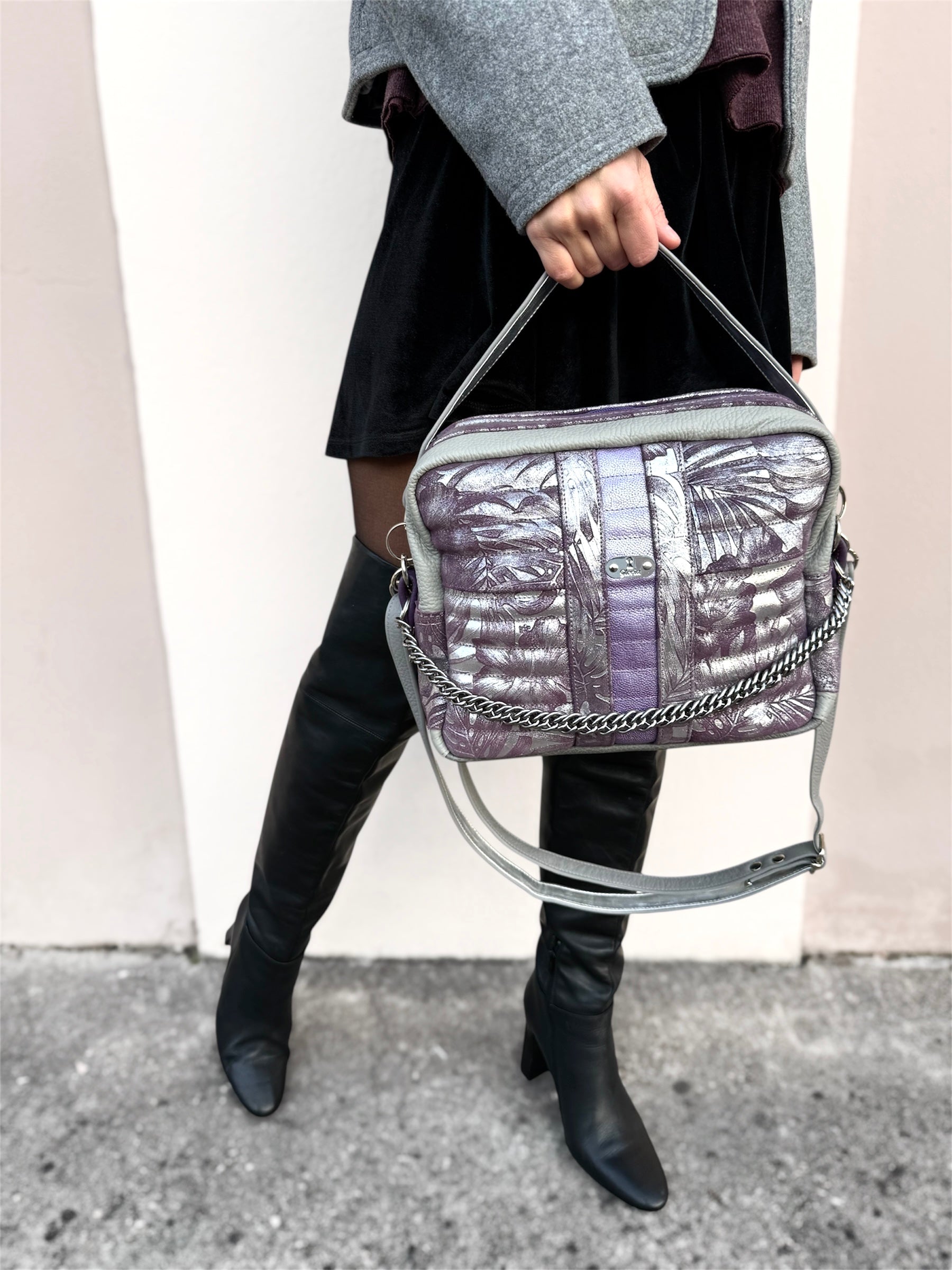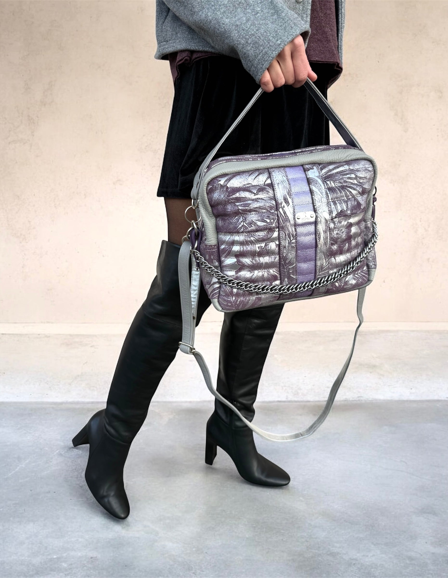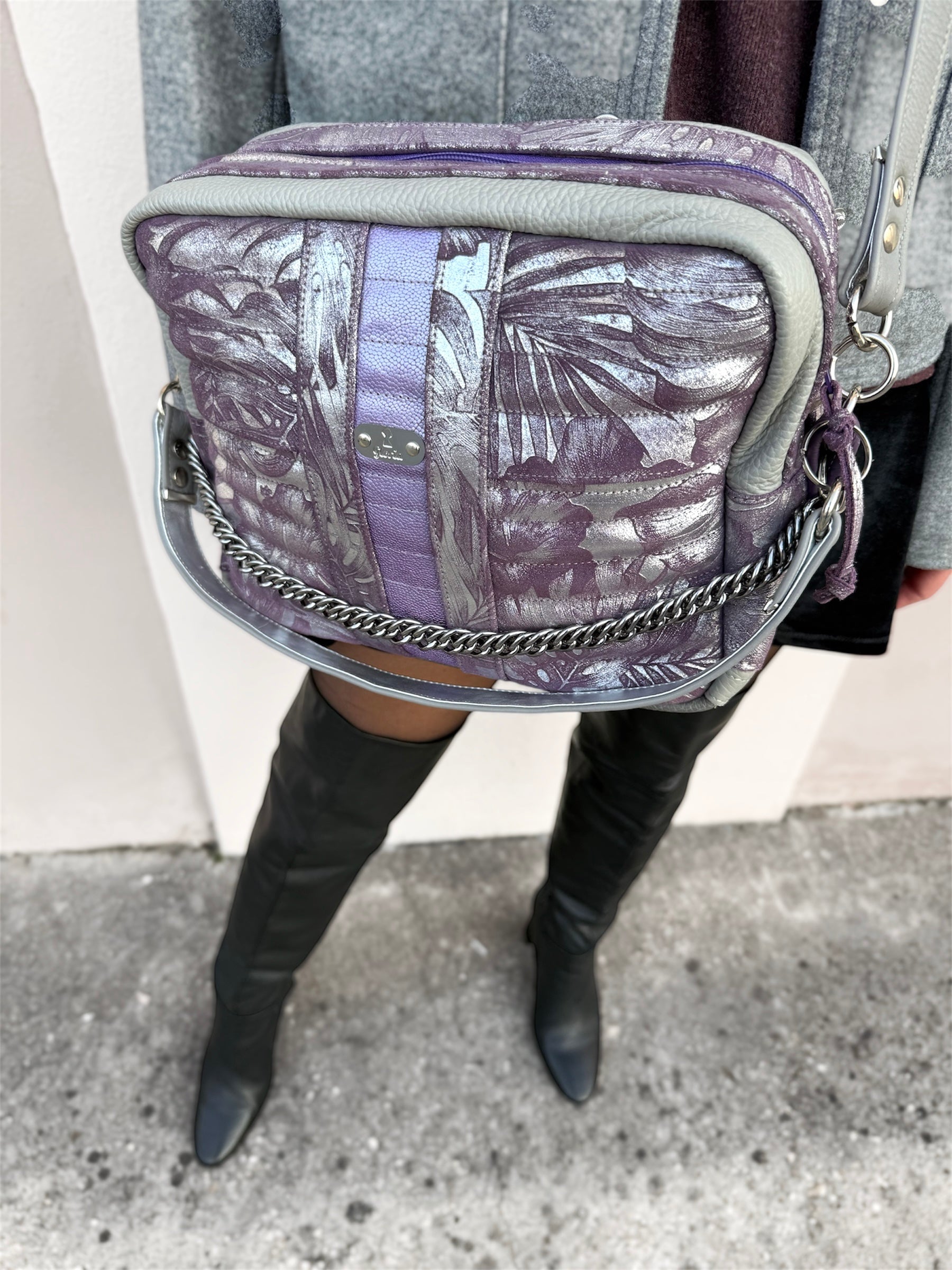 The purple Fairy effectively combines playfulness and femininity. It is unique and made of high quality genuine leather. It can be carried on the shoulder, across the body or as a handbag (using the handle). The long shoulder strap is adjustable in length. The bag is padded with foam and quilted on the front and back. The back is purple and the front is silver-purple. It is lined inside and has two pockets (each on one side). The silver-colored decorative metal chain is removable.