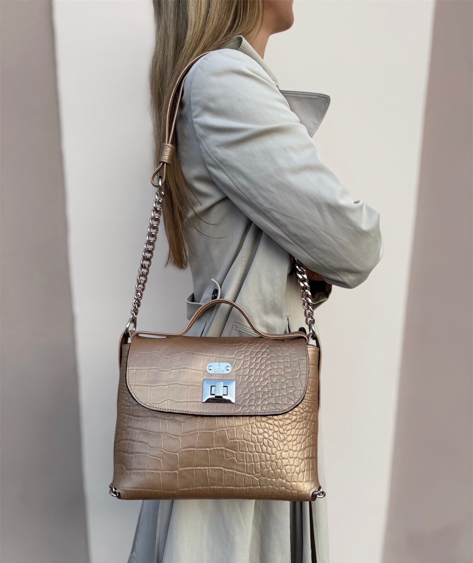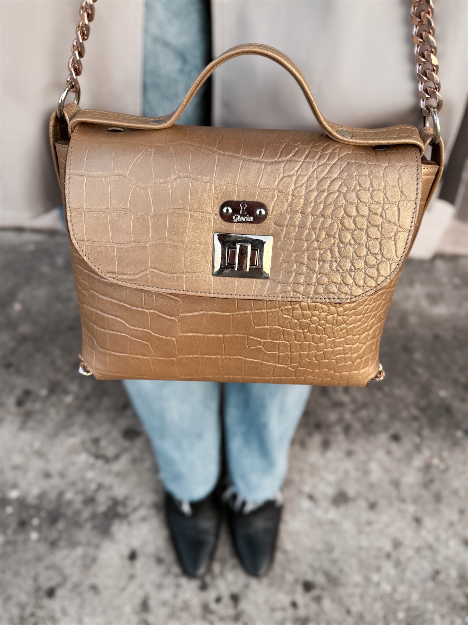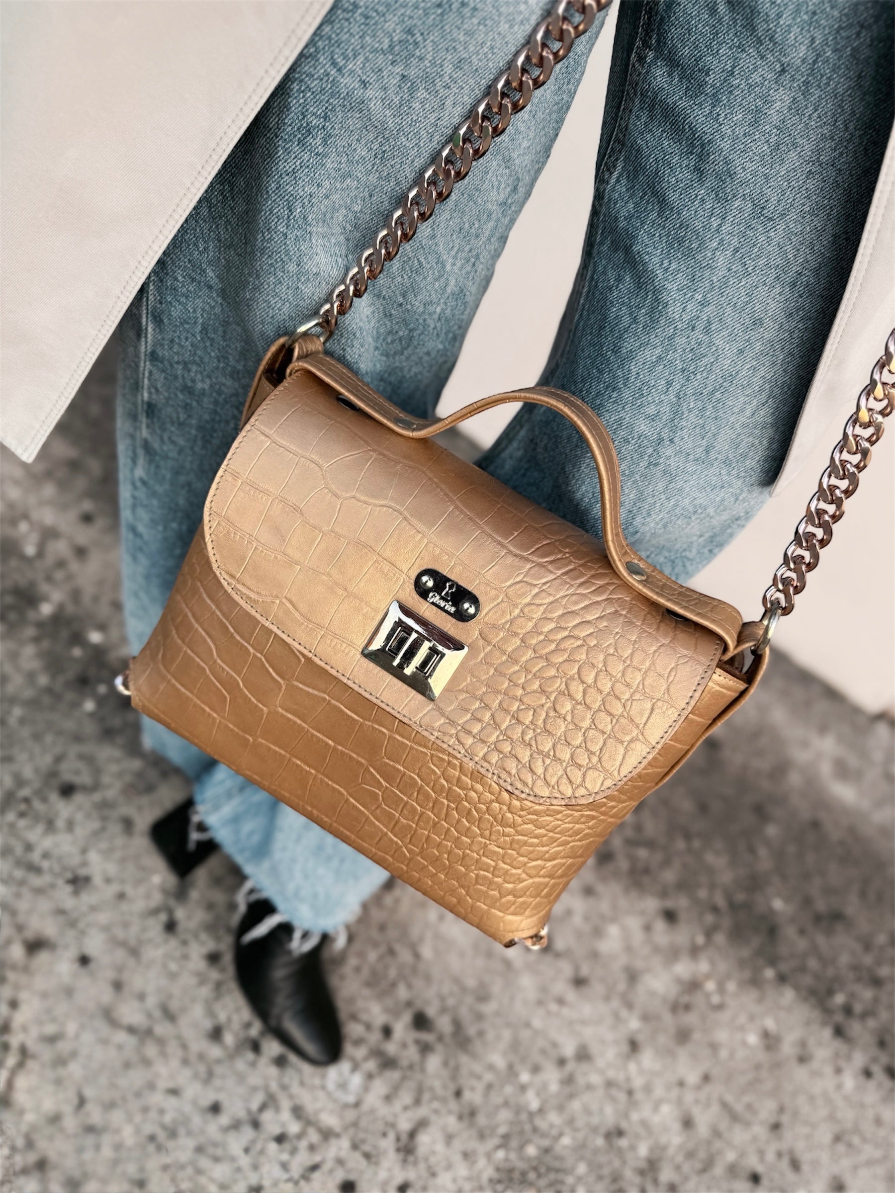 Unikatna strukturirana torbica z imenom Golden Serenity je srednje velika in izdelana iz pravega usnja visoke kakovosti. Zunanjost je zlate barve s croc potiskom, notranjost pa bež. Torbica ima očarljive detajle, poudarjene z rose-gold ketnico na obeh stranskih robih in na obeh straneh nastavljive naramnice. V notranjosti je snemljiv žep na zadrgo, izdelan iz nežno roza usnja s croc potiskom.