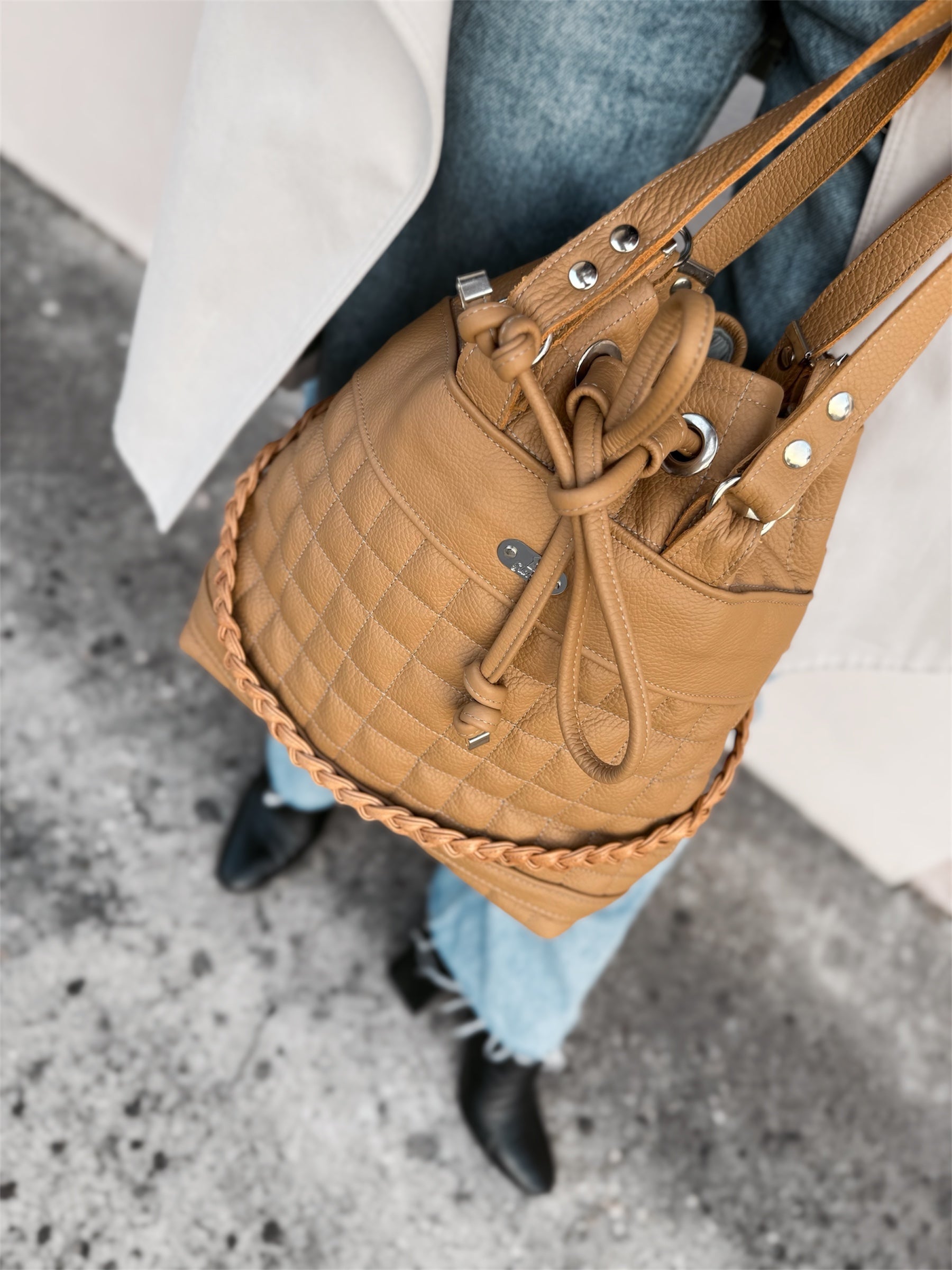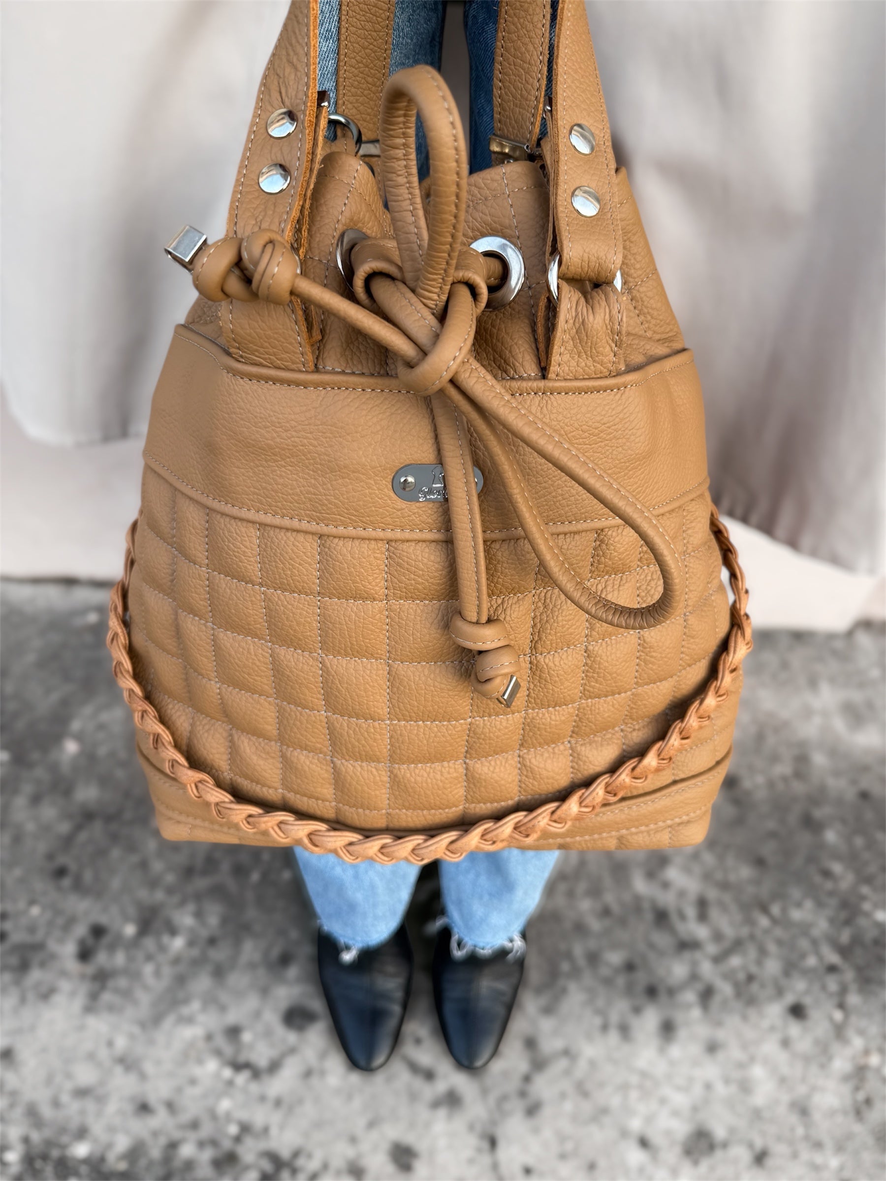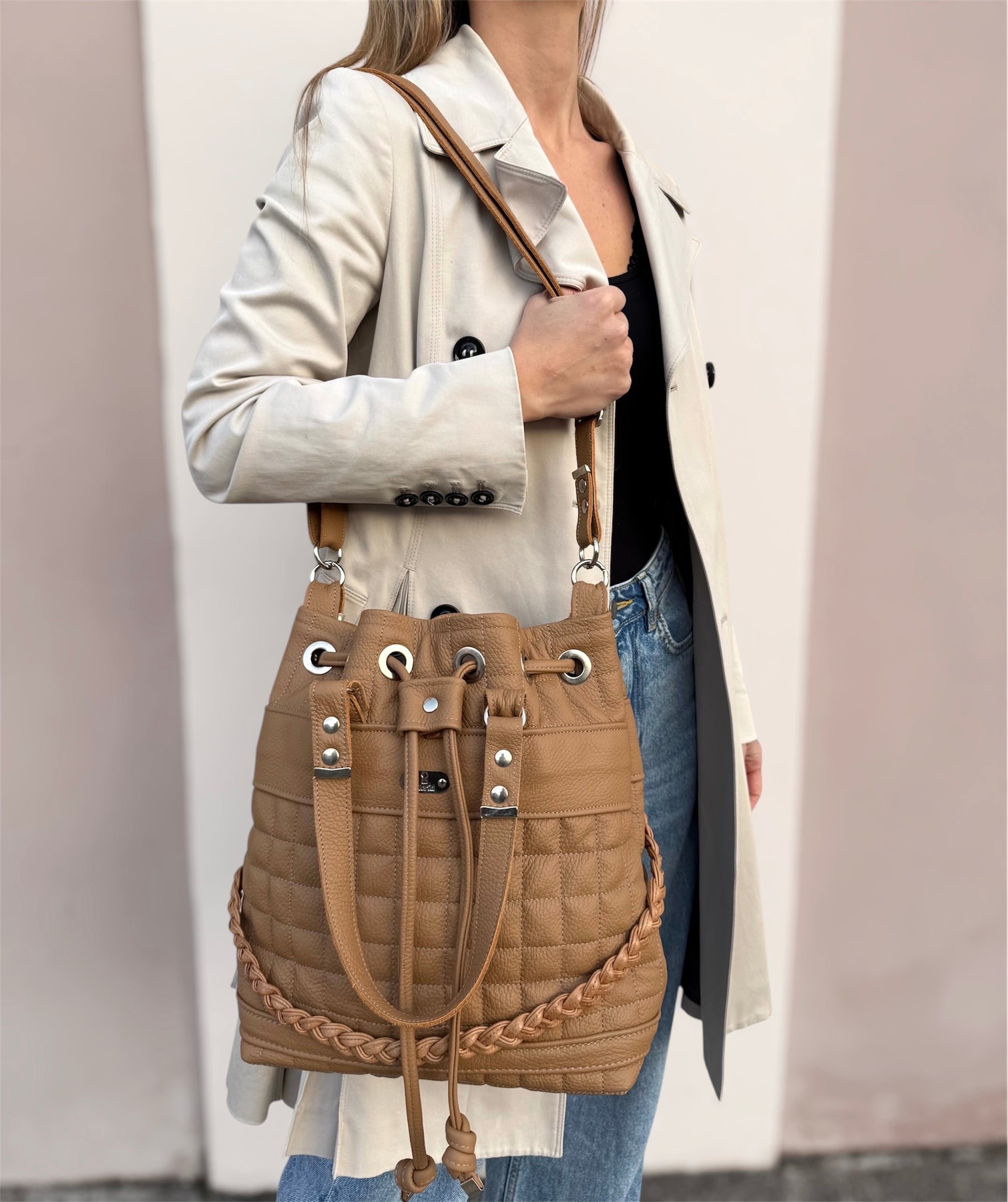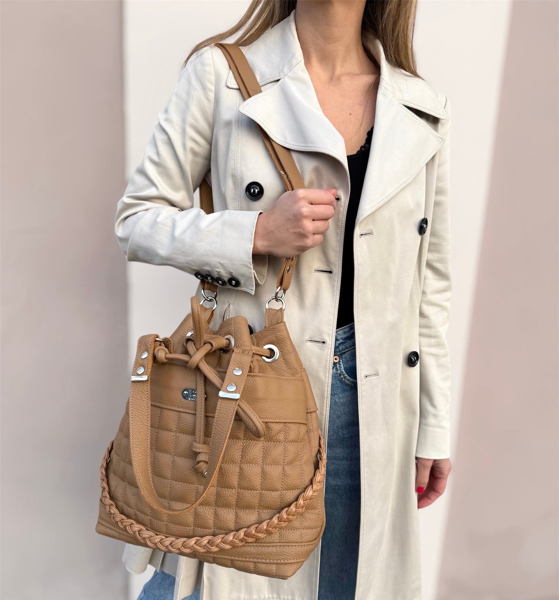 Model Joy odlikuje prostorna notranjost z notranjim žepom, ki zaradi načina zapiranja omogoča enostaven dostop do vsebine torbe. Torba je oblazinjena in prešita po celotni površini, zaradi česar ima popolno obliko tudi, ko v njej ni veliko stvari. Zapira se z usnjenim trakom in drsnikom. Izdelana je iz pravega usnja najboljše kvalitete, ima dva ročaja za nošenje v roki in eno nastavljivo naramnico. Je prijetna za nošenje in ima trdo dno, da stoji pokonci tudi, ko jo odložite. Piko na i torbici da ročno narejena usnjena kitka, ki poskrbi za to, da je torbica še bolj edinstvena.
