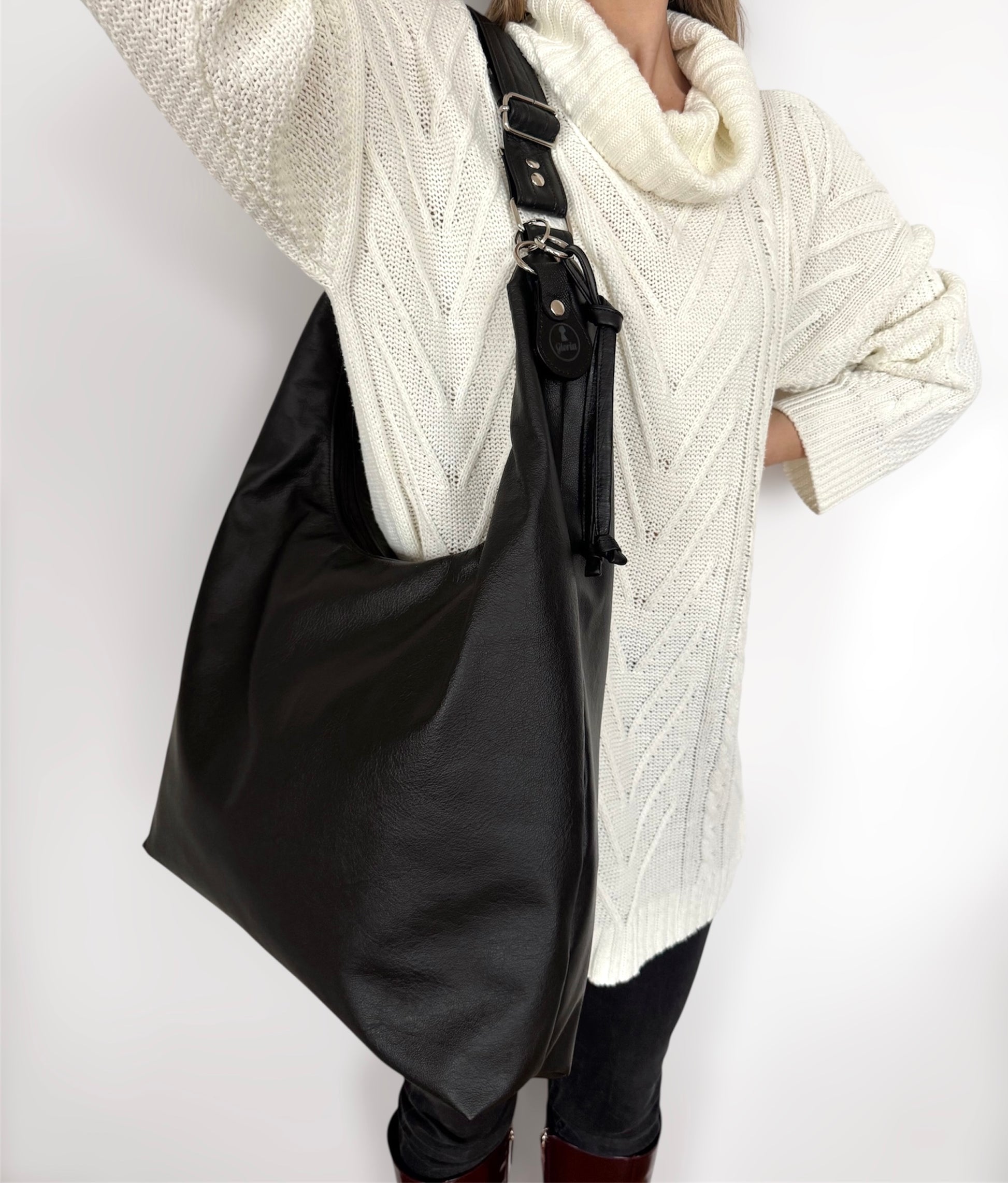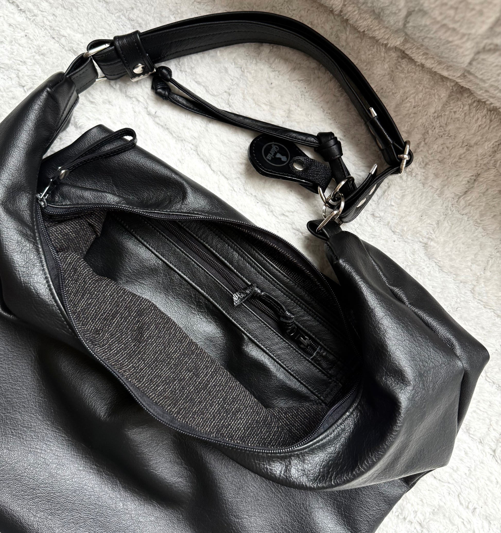 Torba se zapira z zadrgo, prav tako tudi notranji žep. Naramnica črne Hobo Bag (Forever Black) je nastavljive dolžine, kar omogoča nošenje na rami in preko telesa (crossbody). V notranjosti se skriva čudovita in močna podloga, ki daje torbi večjo obstojnost in prefinjenost. Poseben čar doda snemljiv usnjen obesek z vgraviranim logotipom, in detajlom vozla.