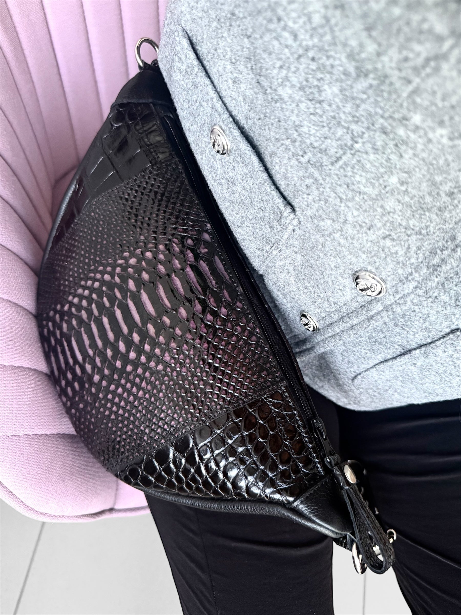 Ena stran je v vijola-črnem croco vzorcu, druga pa v klasičnem črnem croco videzu, kar ti omogoča, da torbico prilagodiš svojemu stilu ali priložnosti. Idealna izbira za vsak dan ali večerne izhode, ko želiš nekaj posebnega.